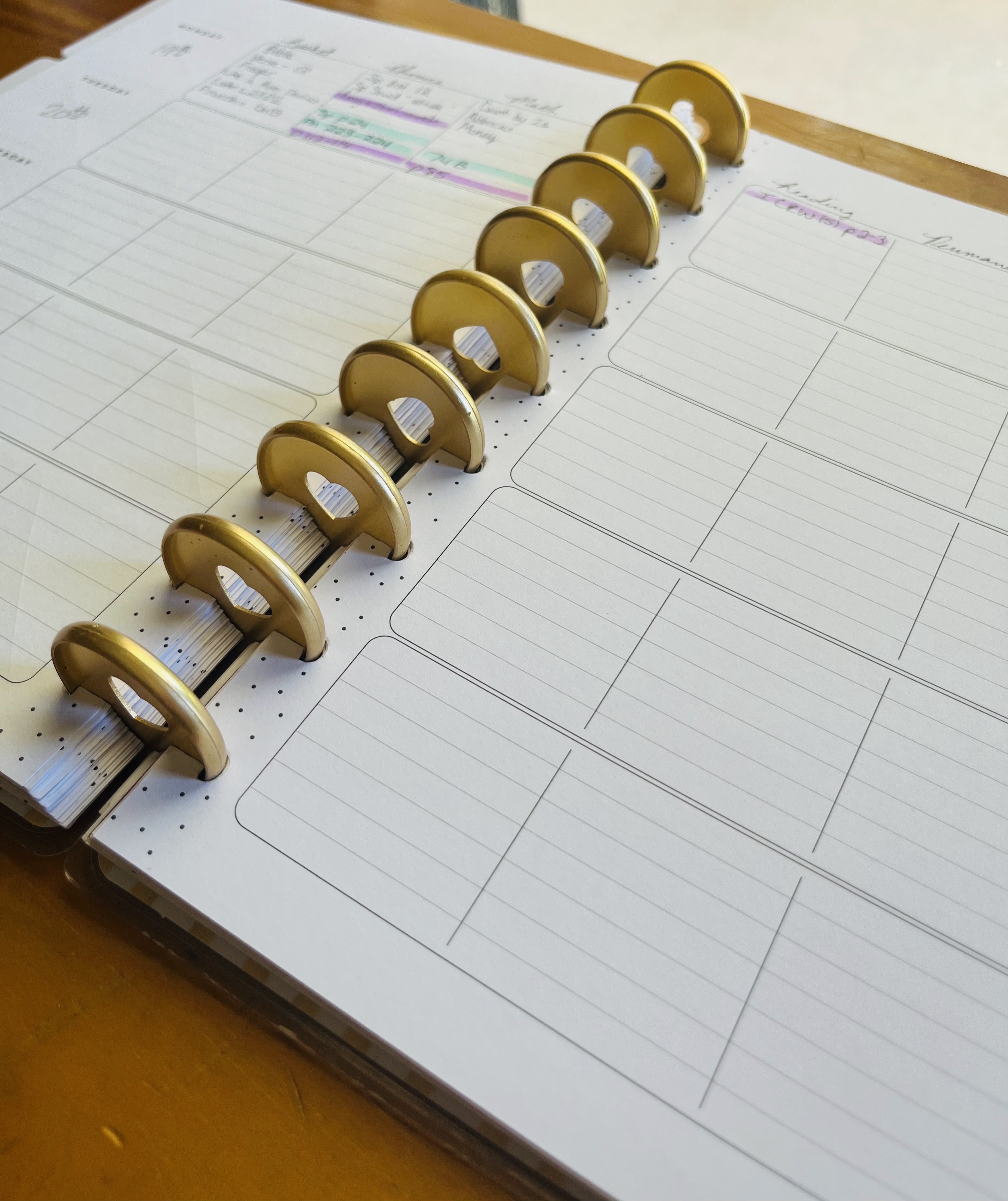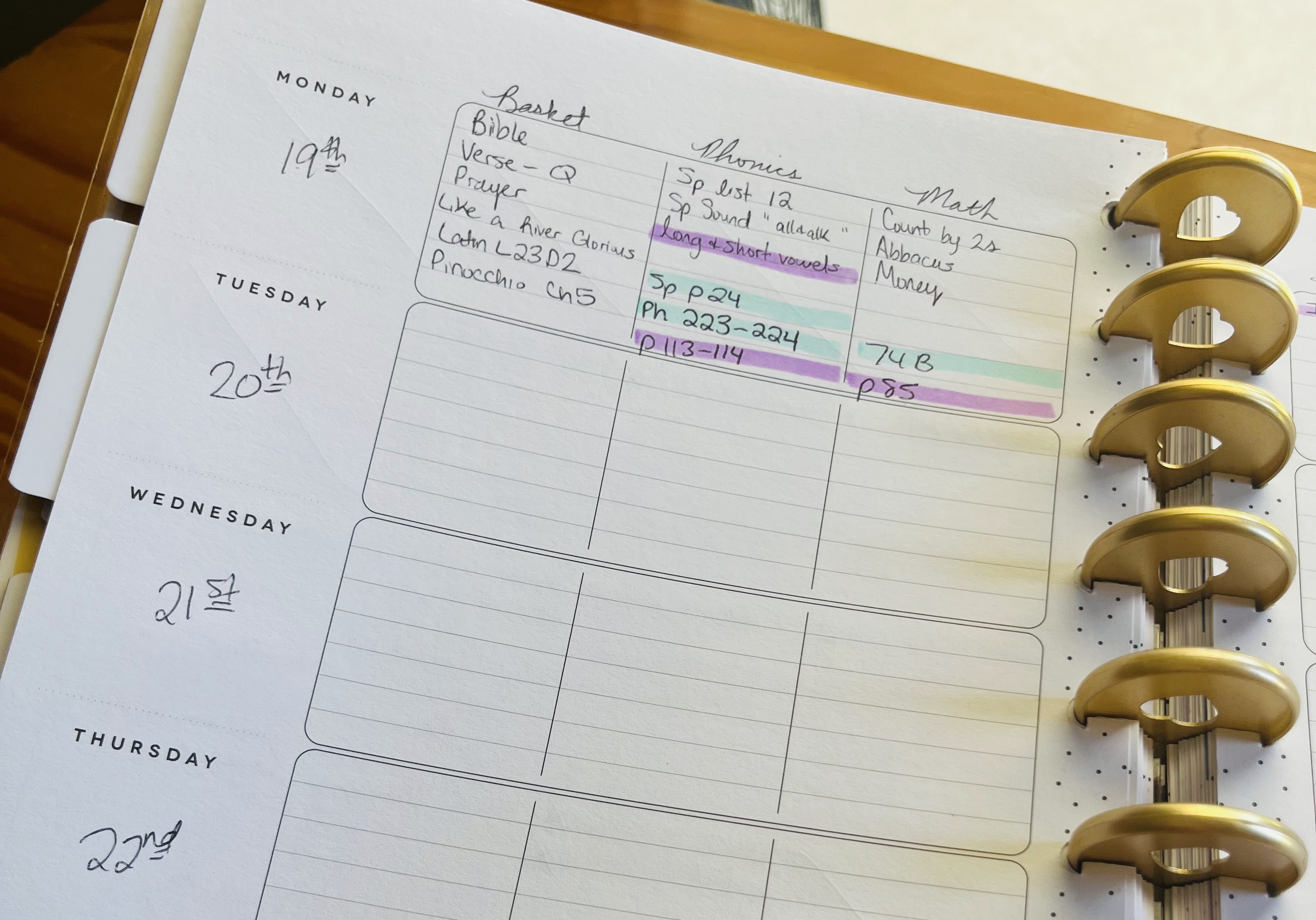 I kept my existing Happy Planner and wrote the loops out on sticky notes that I attach to each child’s folder (fancy, I know). On day 1, I was so tired, I knew we would only be able to do about an hour of school before I needed to go crash. We were able to cover our basket time, phonics, math, and reading – in a little over an hour! For phonics and math, I picked 3 items from their respective loops and assigned a worksheet for both kids to complete. When the hour was up, I wrote down what we did. And we were done! There was no increasingly long plan staring back at me to remind me that I had again failed. I didn’t have to plan to double up on science and history the next day (in fact, on day two I was incredibly sick, and we didn’t do school at all). On day 3, we started by completing the subjects we didn’t get to on day 1: basket time, writing, electives, history and science. And because I was feeling well, we even made it back around to do a small phonics and math lesson!
